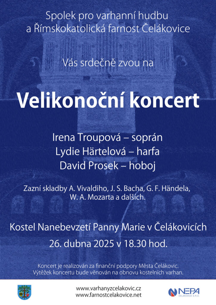 Koncert je pořádán ve spolupráci Spolku pro varhanní hudbu a Římskokatolické farnosti v Čelákovicích s finanční podporou Města Čelákovic.